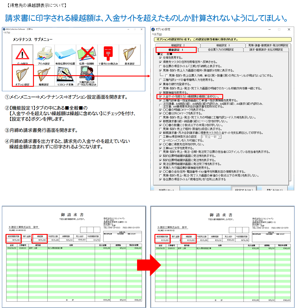 - 請求書に印字される繰越額は、入金サイトを超えたものしか計算されないようにしてほしい。