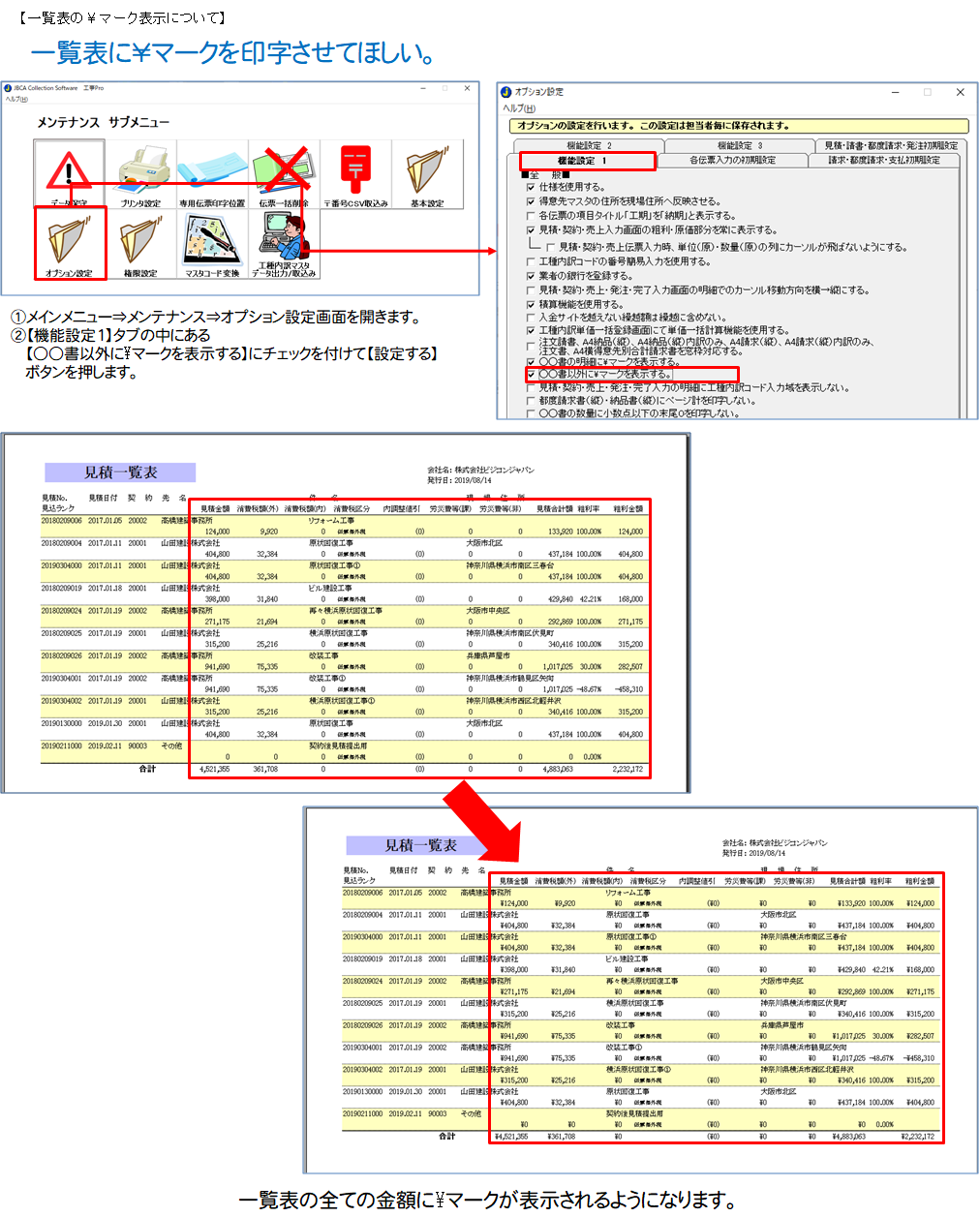 【機能設定1】タブの中にある【〇〇書以外に¥マークを表示する】にチェックを付け、【設定する】ボタンを押します。