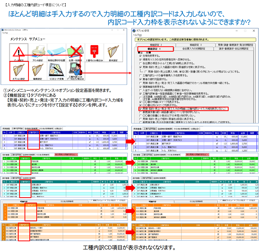 各入力画面の明細に工種内訳コード入力域が表示されなくなります。
