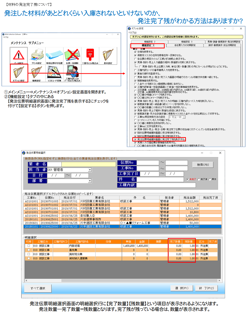 - 発注した材料があとどれくらい入庫されないといけないのか発注完了残がわかる方法はありますか?