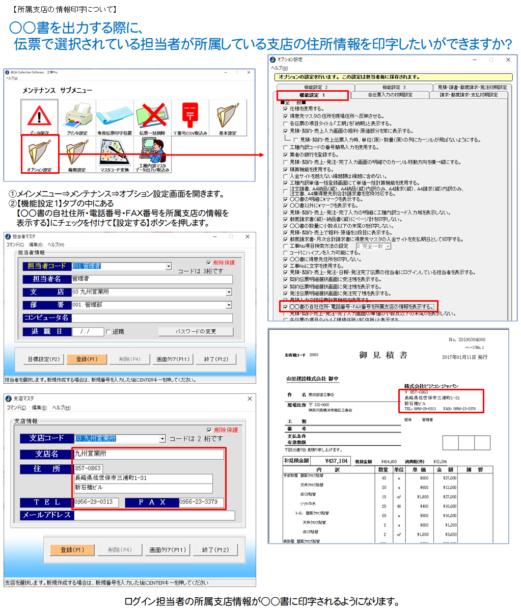 - ○○書を出力する際に、伝票で選択されている担当者が所属している支店の住所情報を印字したいができますか?