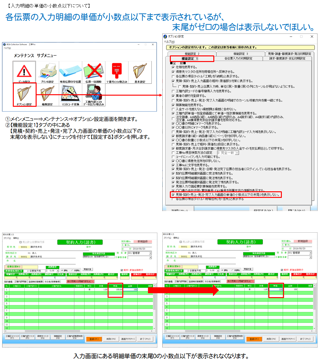 【機能設定1】タブの中にある【見積・契約・売上・発注・完了入力画面の単価の小数点以下の末尾0を表示しない】にチェックを付け、