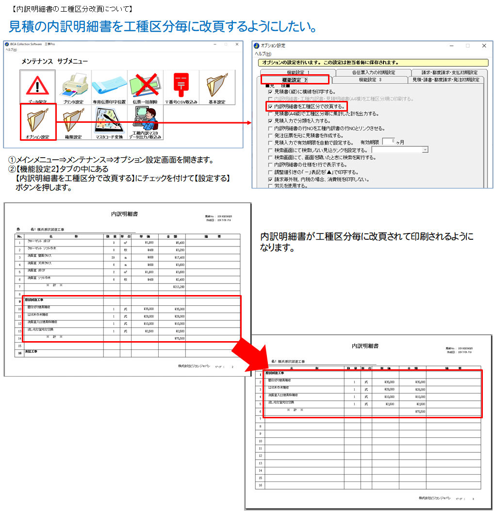 - 見積の内訳明細書を工種区分毎に改頁するようにしたい。