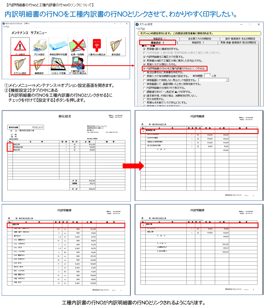 【機能設定2】タブの中にある【内訳明細書の行NOを工種内訳書の行NOとリンクさせる】にチェックを付け、