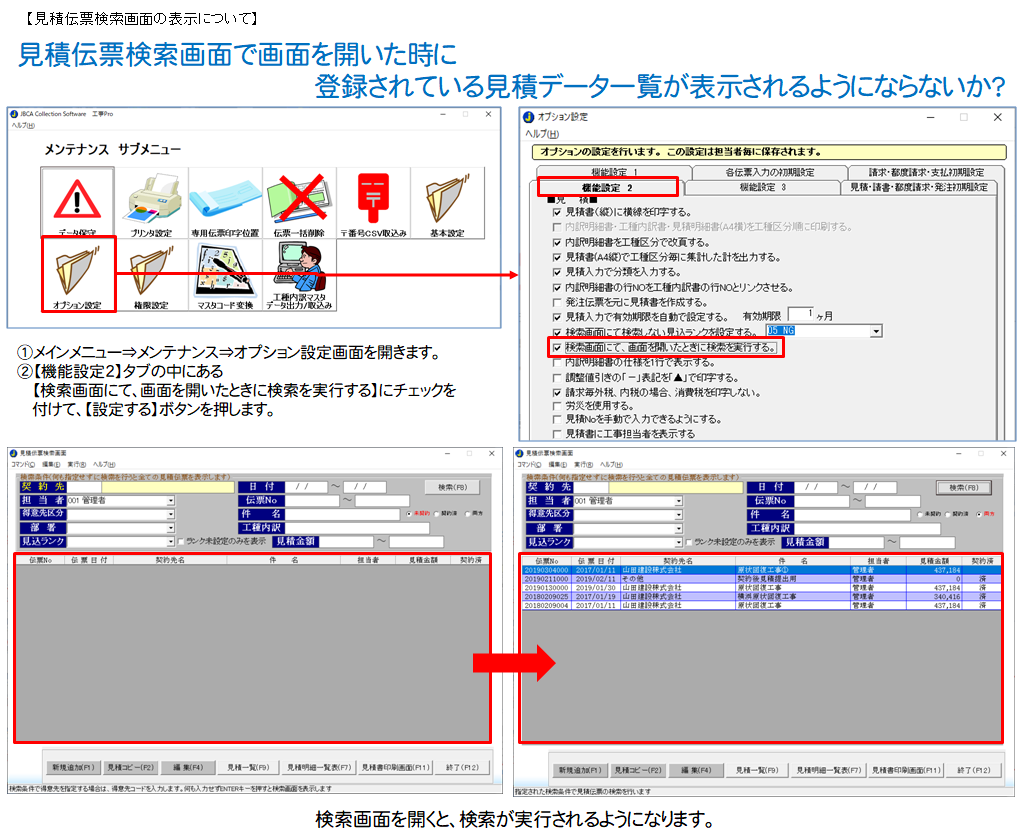- 見積伝票検索画面で画面を開きた時に登録されている見積データ一覧が表示されるようにならないか?