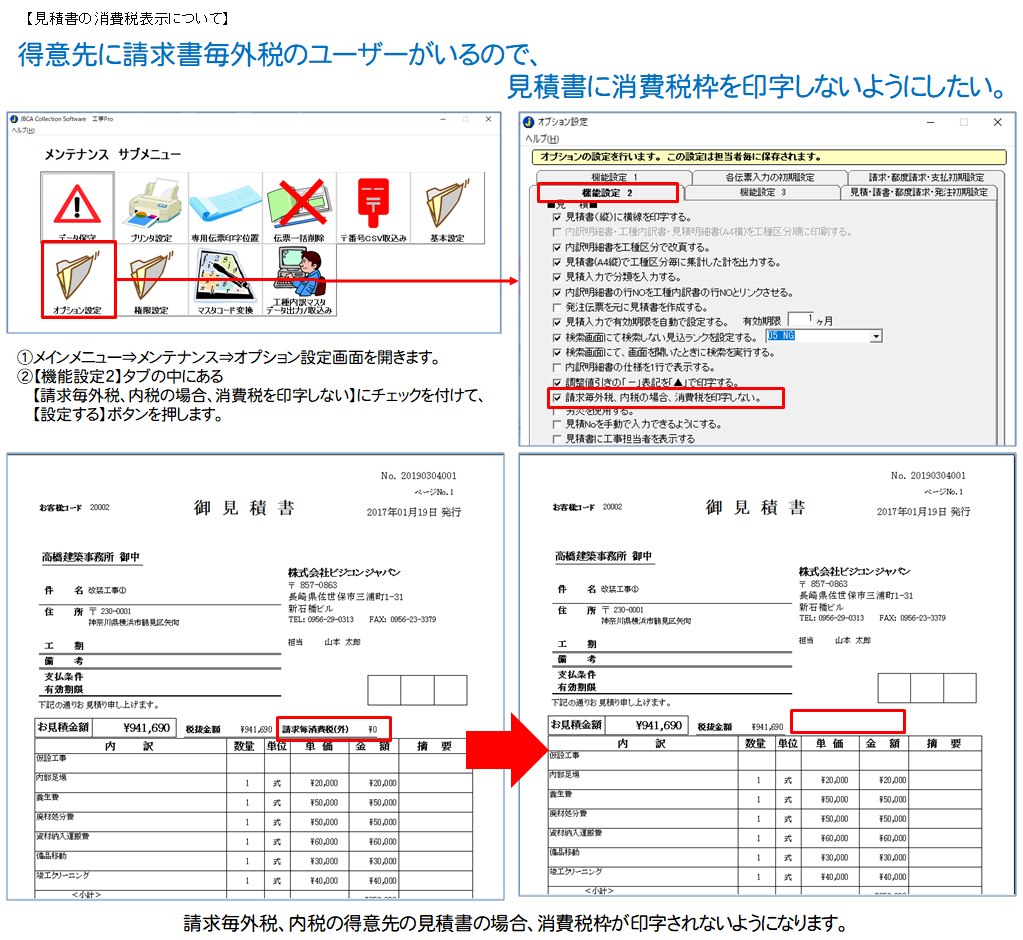 - 得意先に請求書毎外税のユーザーがいるので、見積書に消費税枠を印字しないようにしたい。