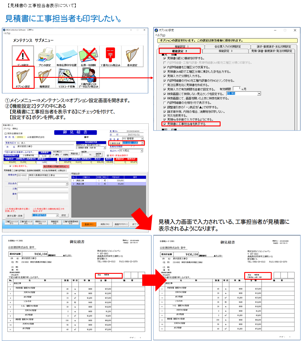 見積書を印刷すると、工事担当者で入力された担当者名が表示されるようになります。