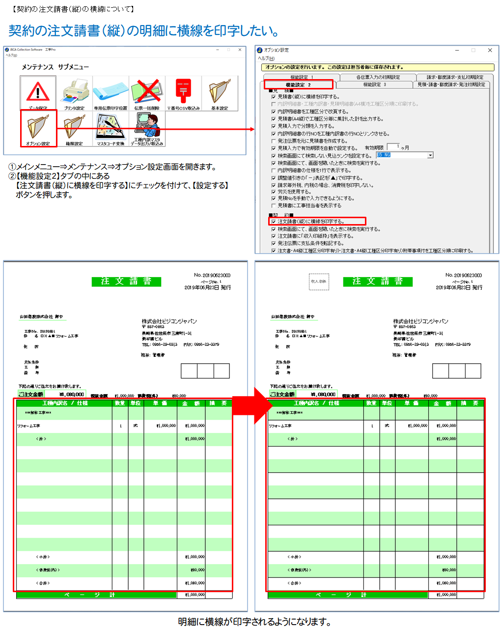 - 契約の注文請書(縦)の明細に横線を印字したい。
