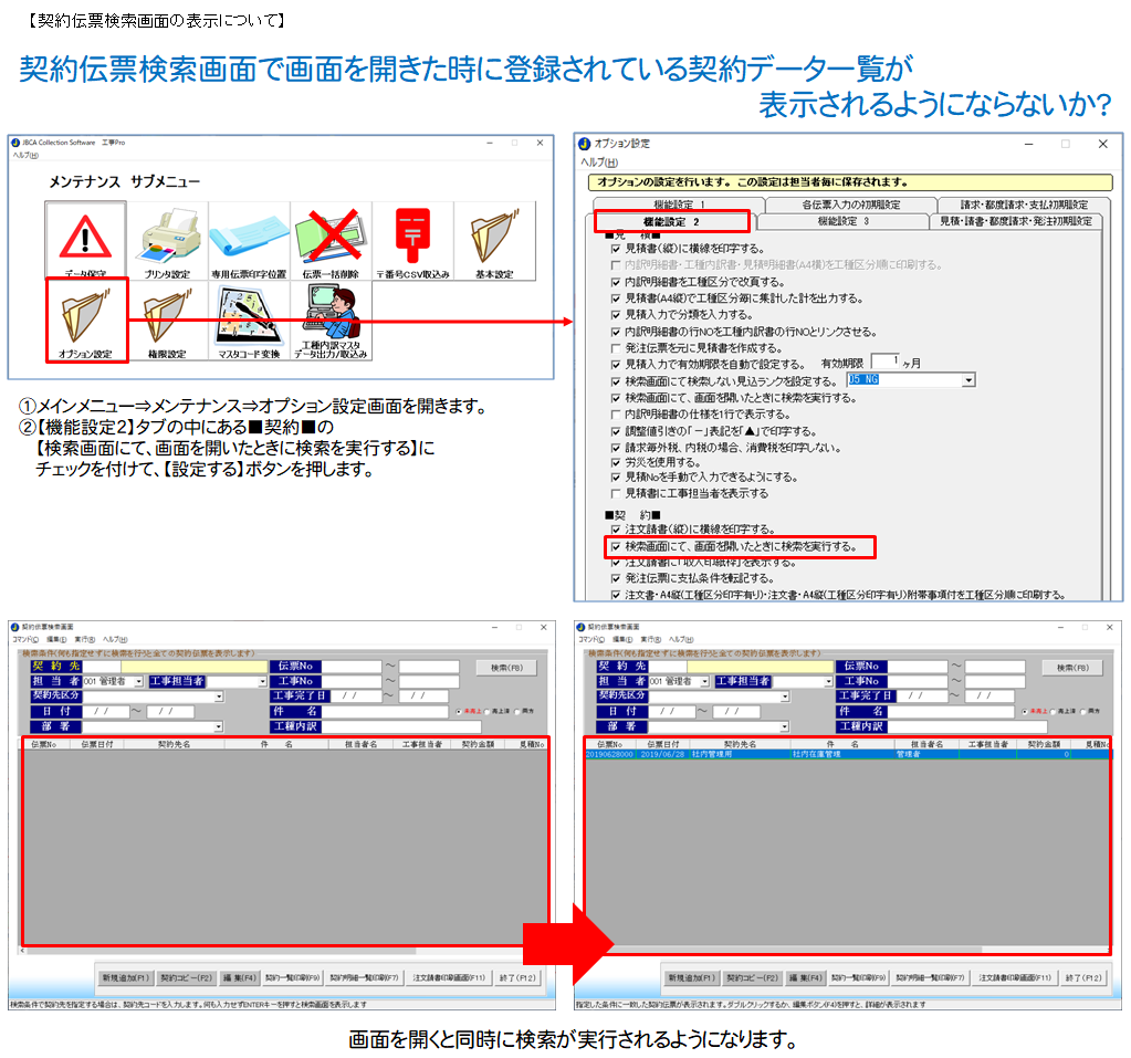 - 契約伝票検索画面で画面を開きた時に登録されている契約データ一覧が表示されるようにならないか?