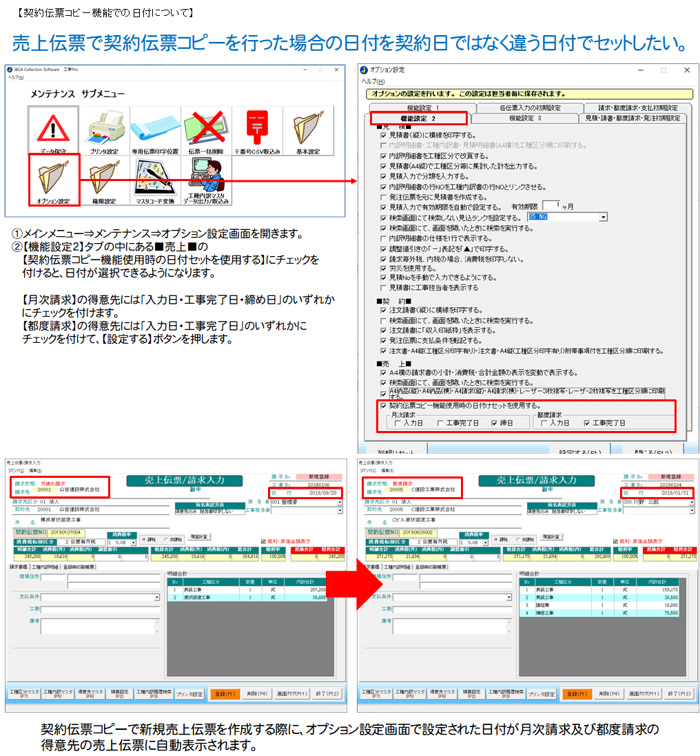 - 売上伝票で契約伝票コピーを行った場合の日付を契約日ではなく違う日付でセットしたい。