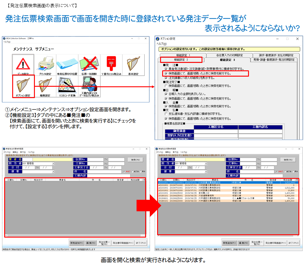 【機能設定3】タブの中にある■発注■の【検索画面にて、画面を開いたときに検索を実行する】にチェックを付け、