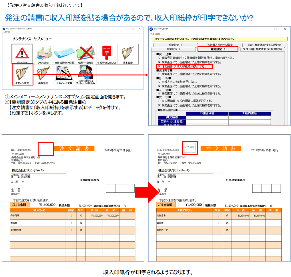 【機能設定3】タブの中にある■発注■の【注文請書に「収入印紙枠」を表示する】にチェックを付け、