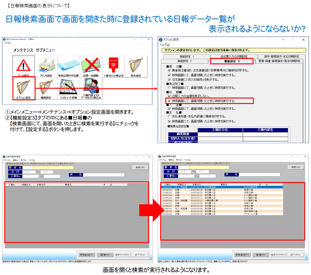【機能設定3】タブの中にある■日報■の【検索画面にて、画面を開いたときに検索を実行する】にチェックを付け、