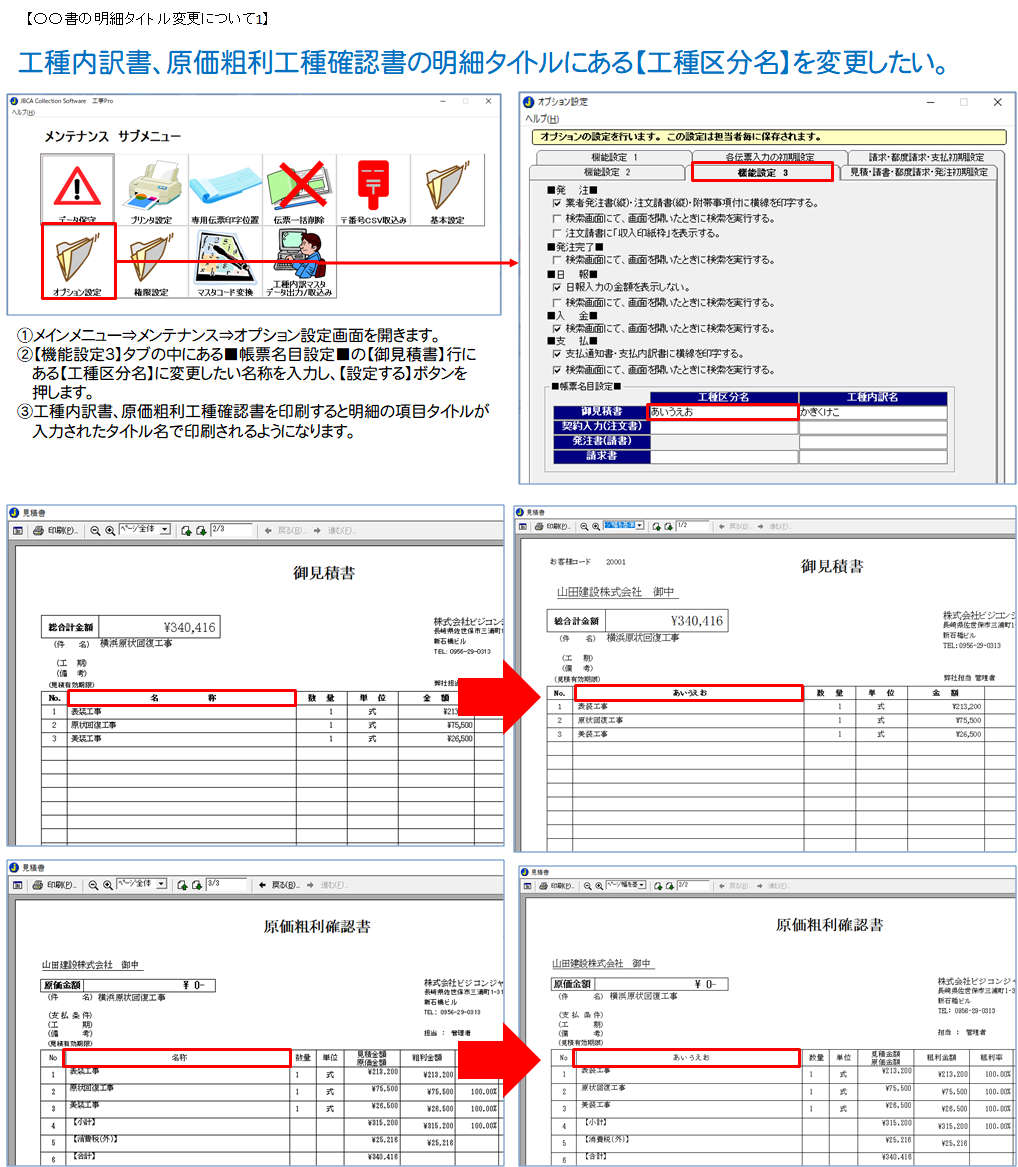 - 工種内訳書、原価粗利工種確認書の明細タイトルにある【工種区分名】を変更したい。