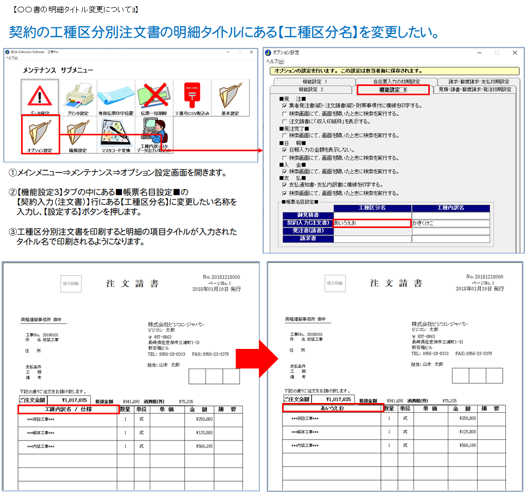 工種区分別注文書・受注工種内訳書を印刷すると入力された名称でタイトルが印字されるようになります。