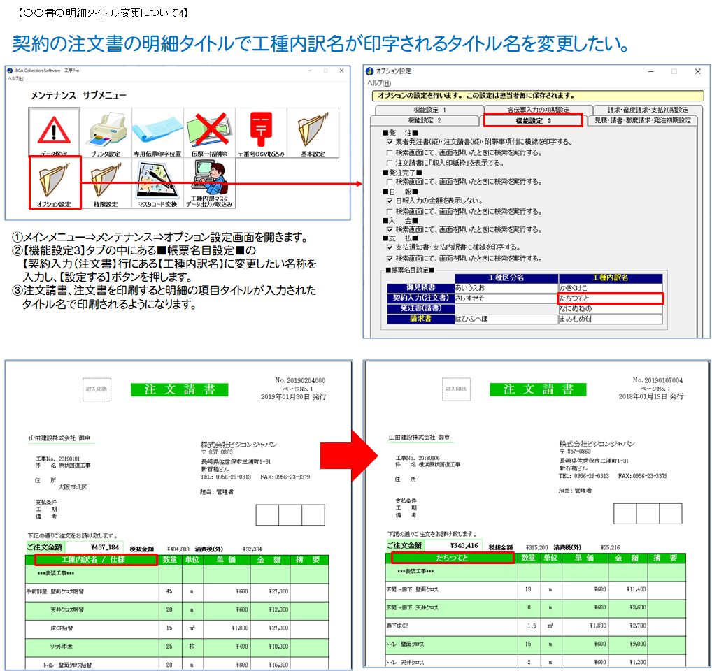 - 契約の注文書の明細タイトルで工種内訳名が印字されるタイトル名を変更したい。