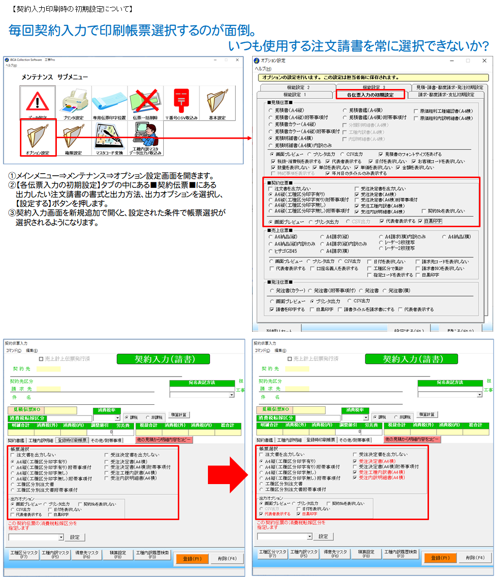 - 毎回契約入力で印刷帳票選択するのが面倒。いつも使用する注文請書を常に選択できないか?