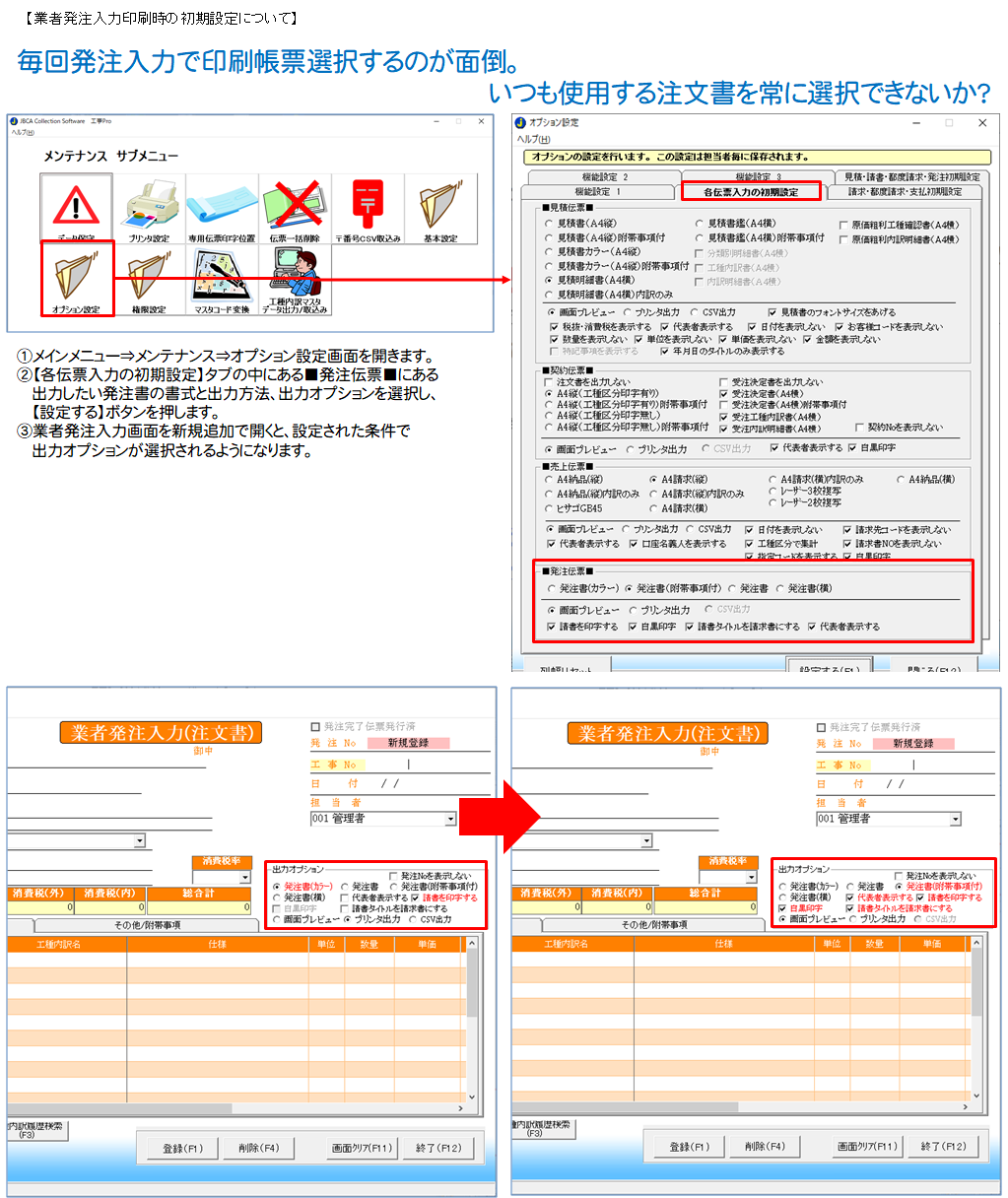 - 毎回発注入力で印刷帳票選択するのが面倒。いつも使用する注文書を常に選択できないか?