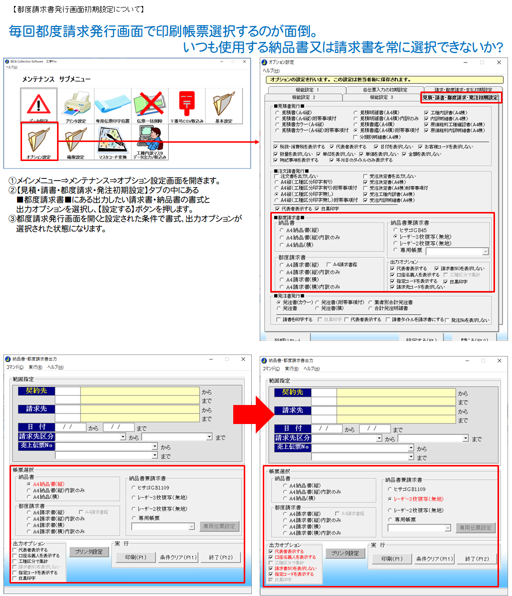 - 毎回都度請求発行画面で印刷帳票選択するのが面倒。いつも使用する納品書又は請求書を常に選択できないか?