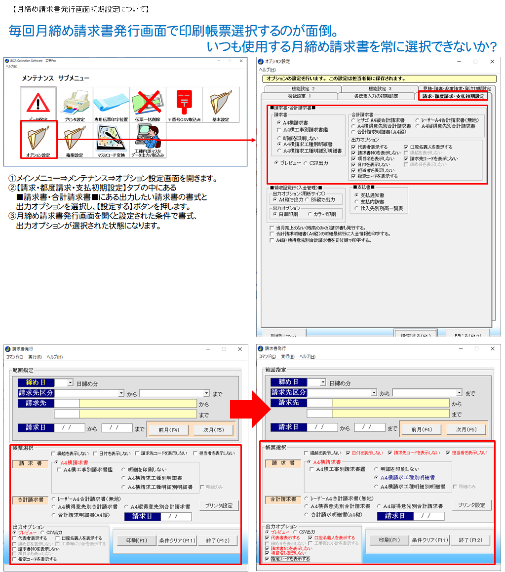 - 毎回月締め請求書発行画面で印刷帳票選択するのが面倒。いつも使用する月締め請求書を常に選択できないか?