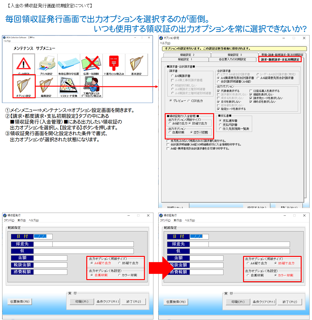 いつも使用する領収証の出力オプションを常に選択できないか?