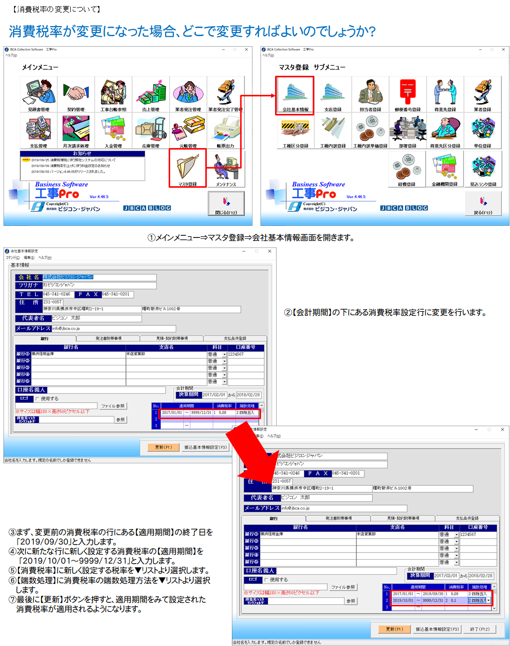 【消費税率】に新たな消費税率、【端数処理】を選択し、【更新】ボタンを押すと、