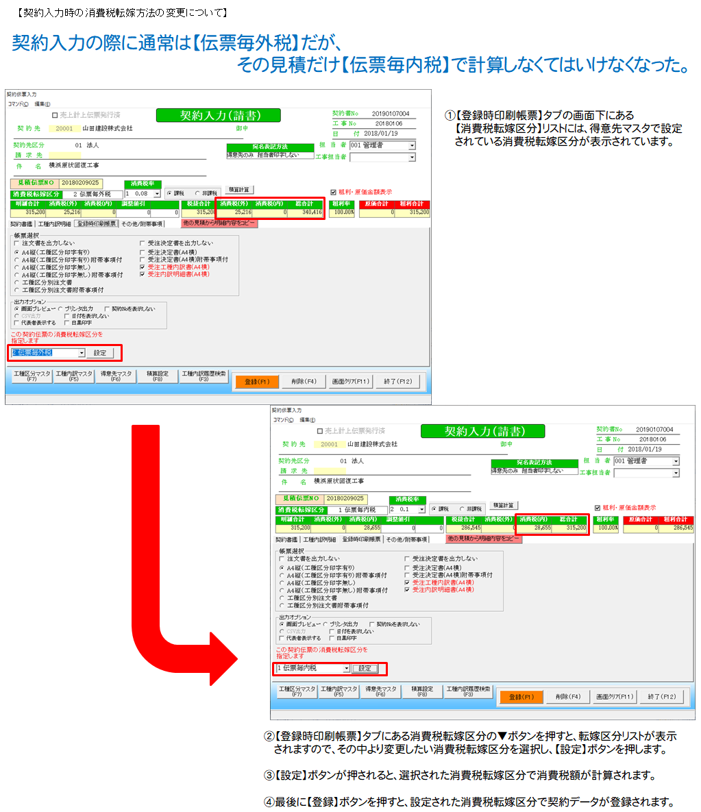【設定】ボタンを押すと、表示されている契約伝票のみが変更された消費税転嫁区分で消費税計算され、登録できます。