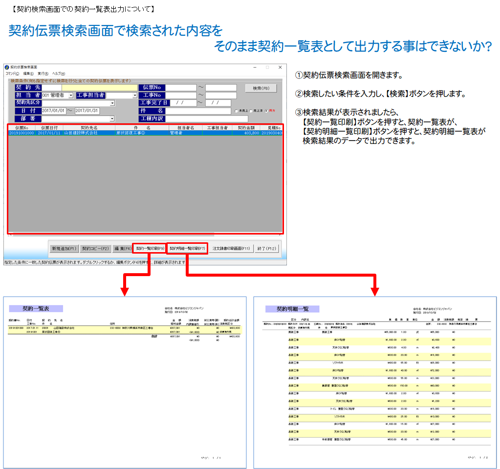 - 契約伝票検索画面で検索された内容をそのまま契約一覧表として出力する事はできないか?