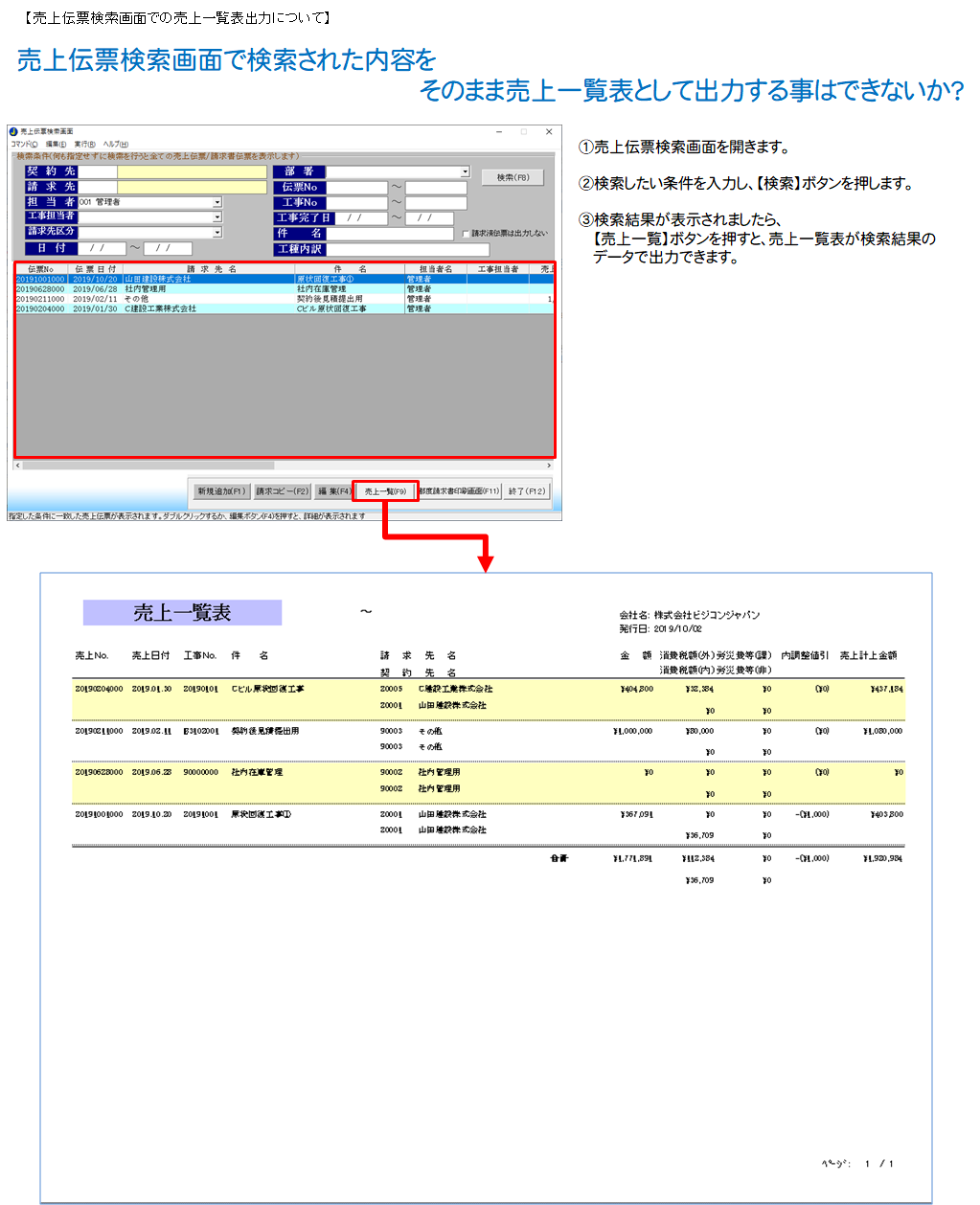 - 売上伝票検索画面で検索された内容をそのまま売上一覧表として出力する事はできないか?