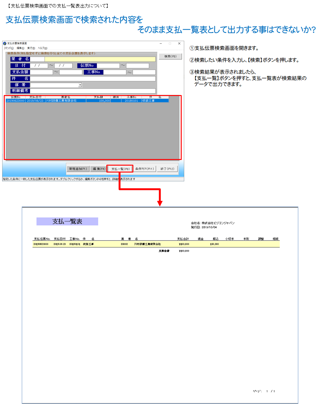 - 支払伝票検索画面で検索された内容をそのまま支払一覧表として出力する事はできないか?