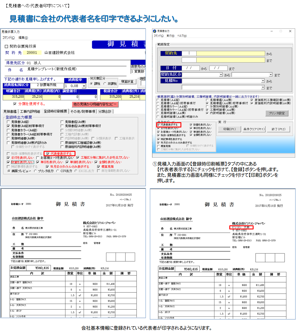 見積入力画面の【登録時印刷帳票】タブの中にある【代表者表示する】をチェックする事で