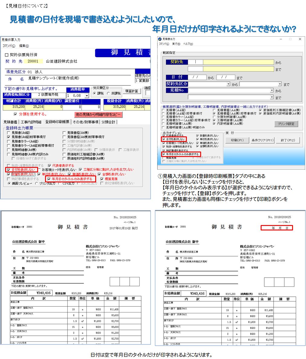 - 見積書の日付を現場で書き込むようにしたいので、年月日だけが印字されるようにできないか?
