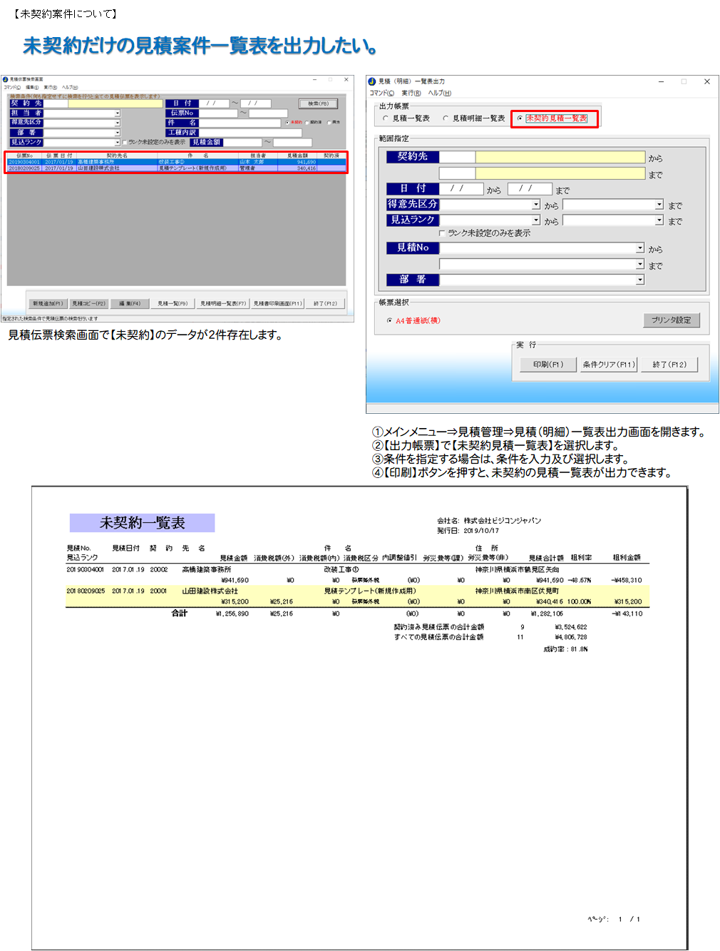 メインメニュー⇒見積管理⇒見積(明細)一覧表出力画面を開きます。 【出力帳票】で【未契約見積一覧表】を選択し、【印刷】ボタンを押すと、未契約一覧表を出力する事ができます。