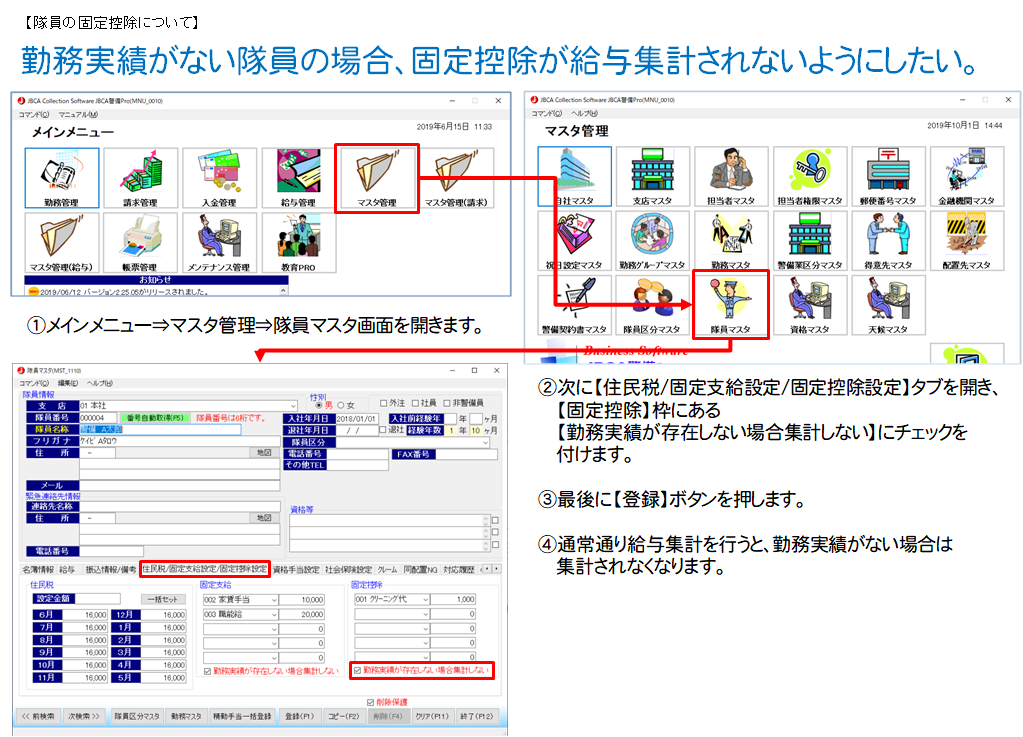 - 勤務実績がない隊員の場合、固定控除が給与集計されないようにしたい。