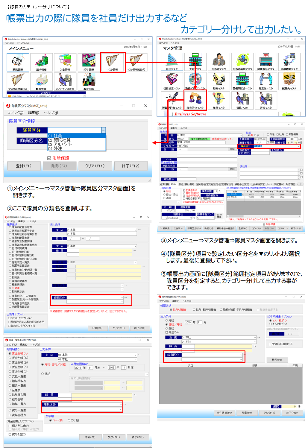 - 帳票出力の際に隊員を社員だけ出力するなどカテゴリー分けして出力したい。