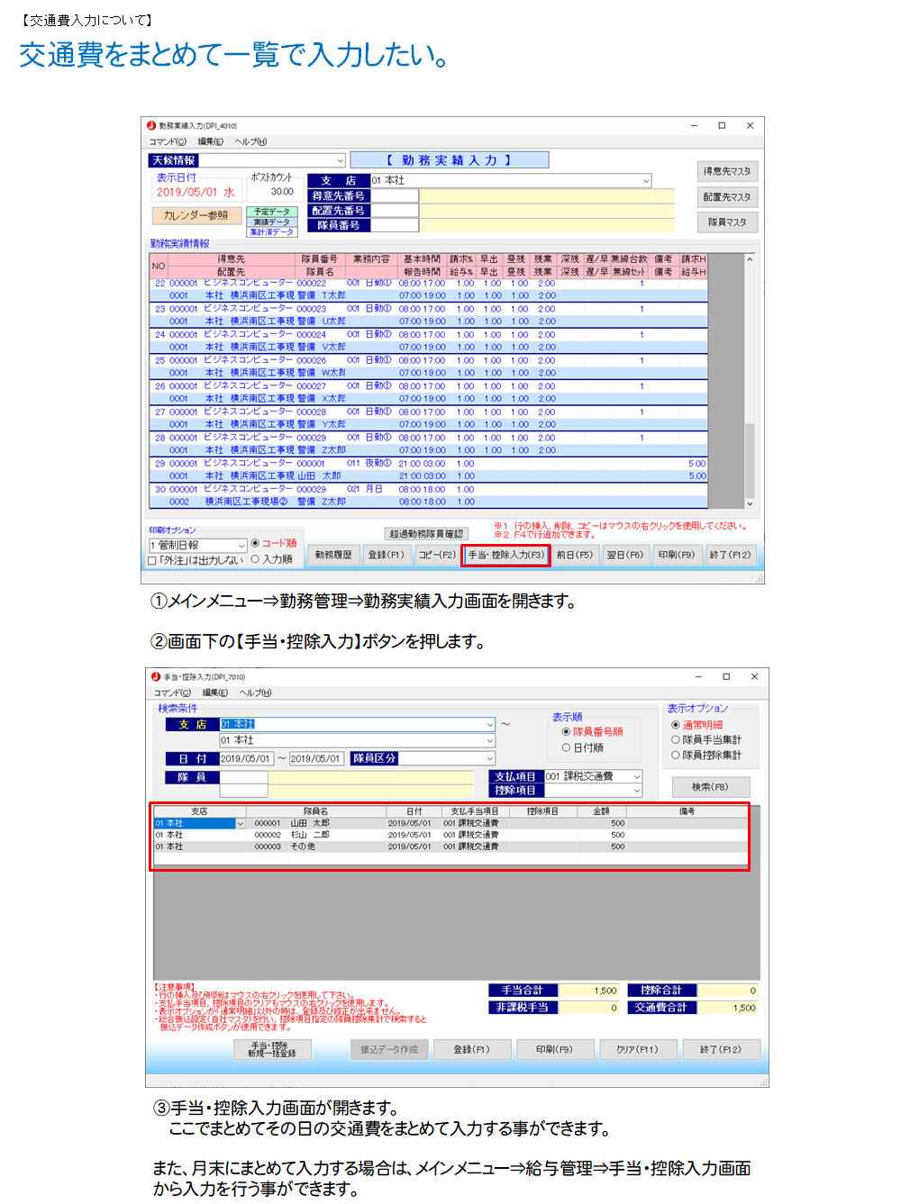 月末にまとめて入力する場合は、メインメニュー⇒給与管理⇒手当・控除入力画面より入力する事ができます。
