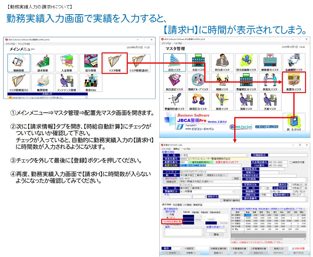 - 勤務実績入力画面で実績を入力すると、【請求H】に時間が表示されてしまう。