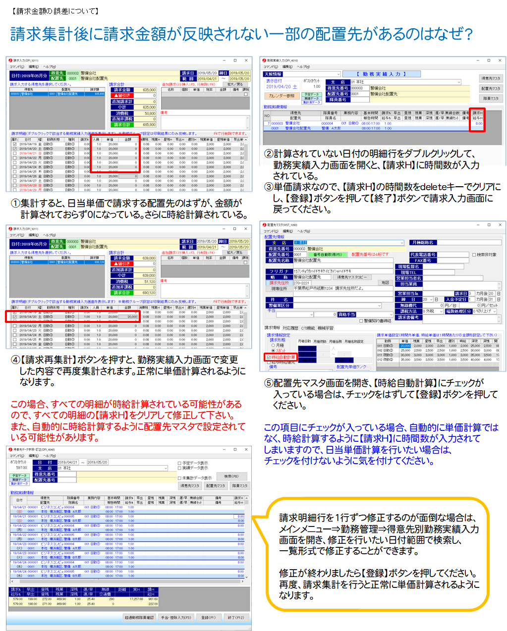 【請求H】の時間をクリアして頂き、再度請求集計を行って頂くと正常な請求金額が計算されるようになります。