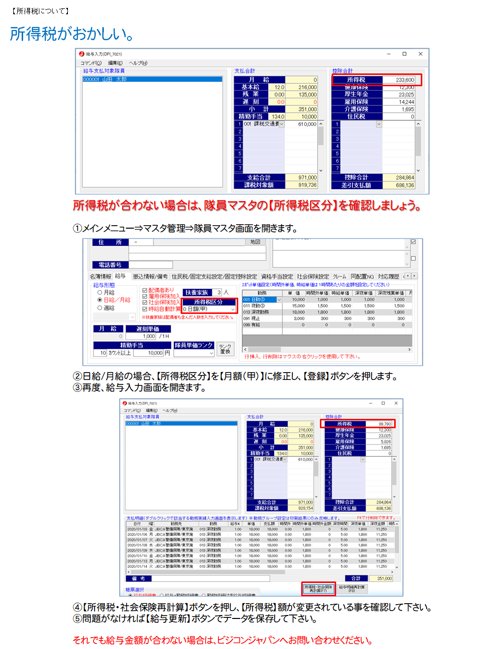 再度、給与入力画面を開き、【所得税・社会保険再計算】ボタンを押して、所得税額を再計算して下さい。
