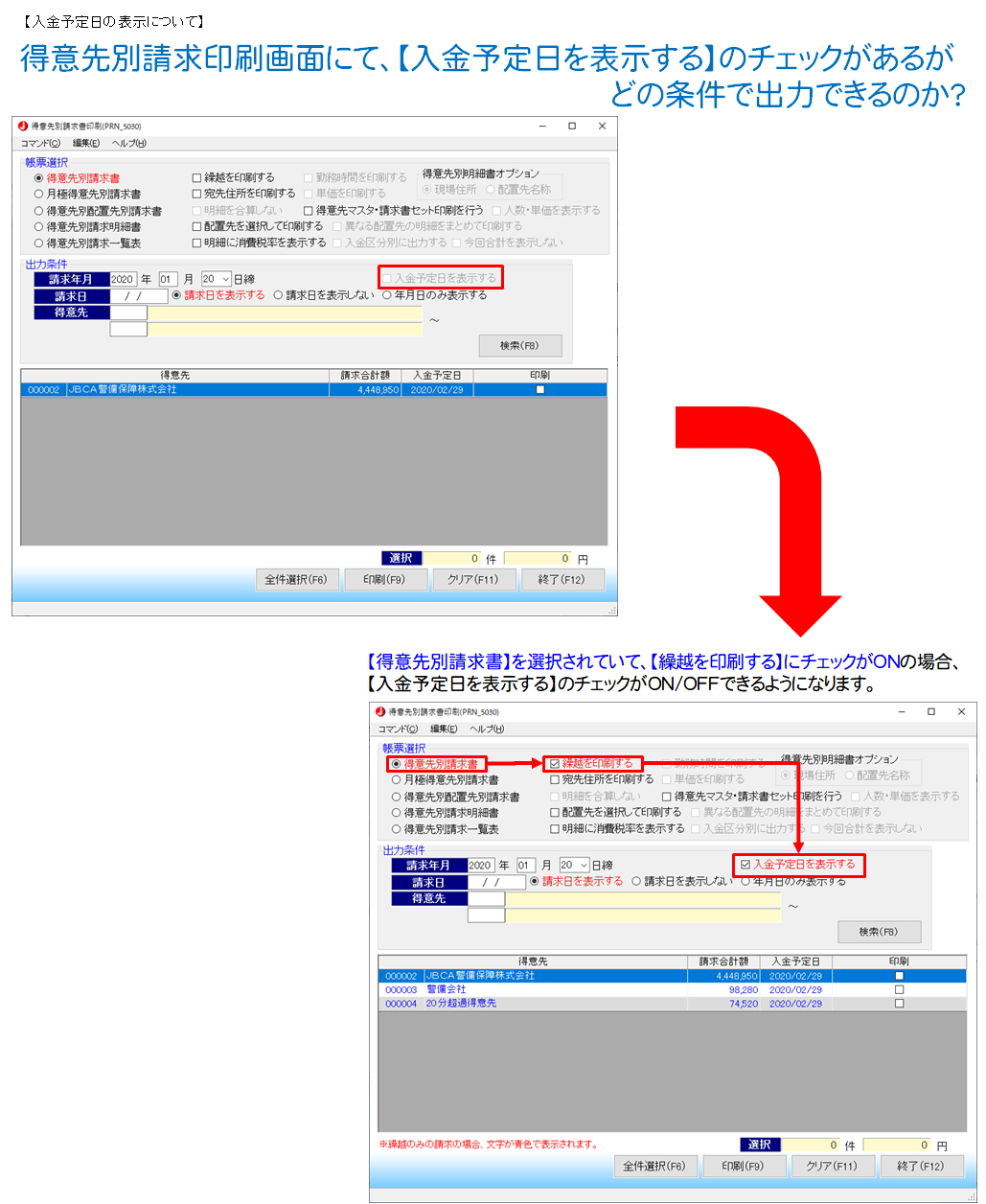 - 得意先別請求印刷画面にて、【入金予定日を表示する】のチェックがあるがどの条件で出力できるのか?