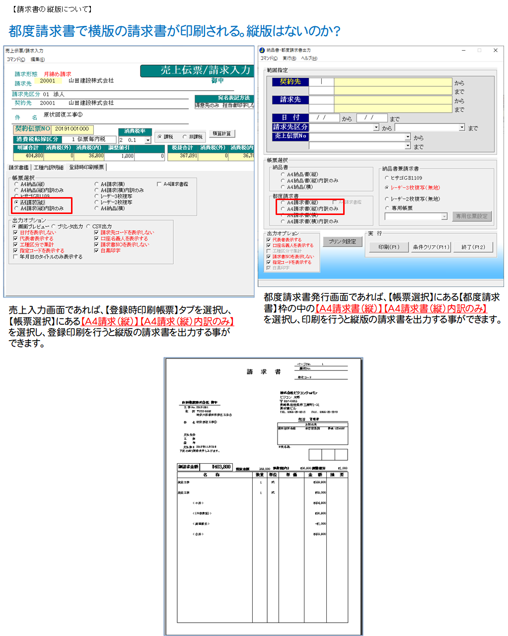 都度請求書発行画面の【帳票選択】にある【A4請求書(縦)】【A4請求書(縦)内訳のみ】を選択すると縦版の請求書を