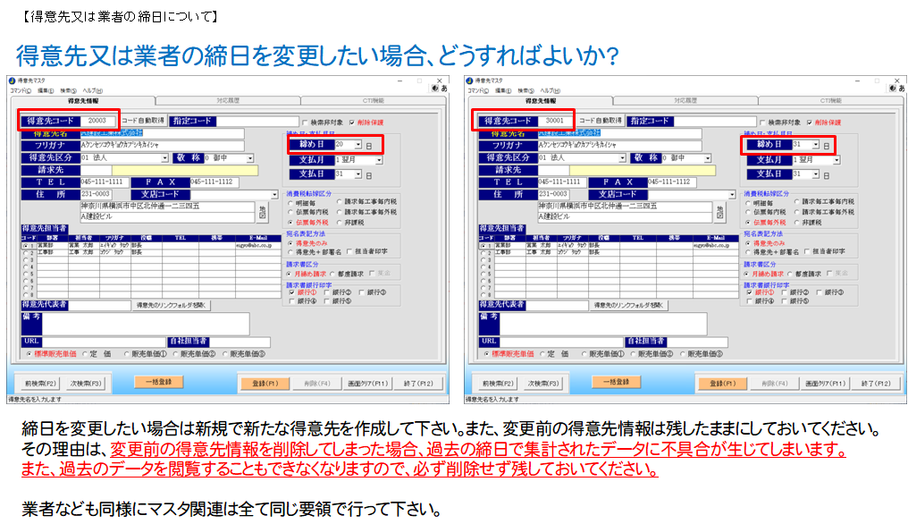 変更前の得意先又は業者のデータはのこしたままにしておいてください。