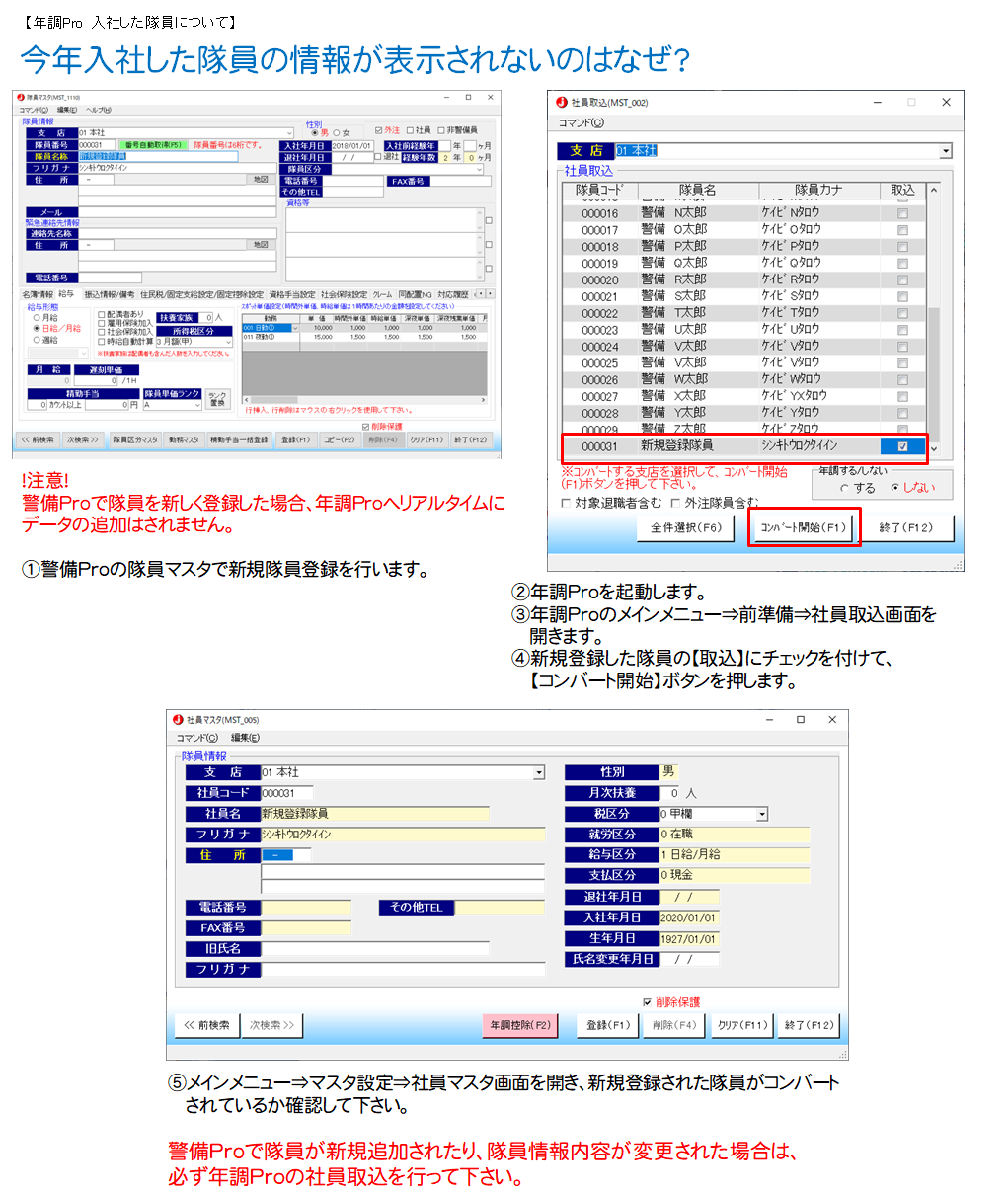 警備Pro側で隊員情報を追加したり、変更を行った場合は必ず年調Pro側で社員取込を行って下さい。