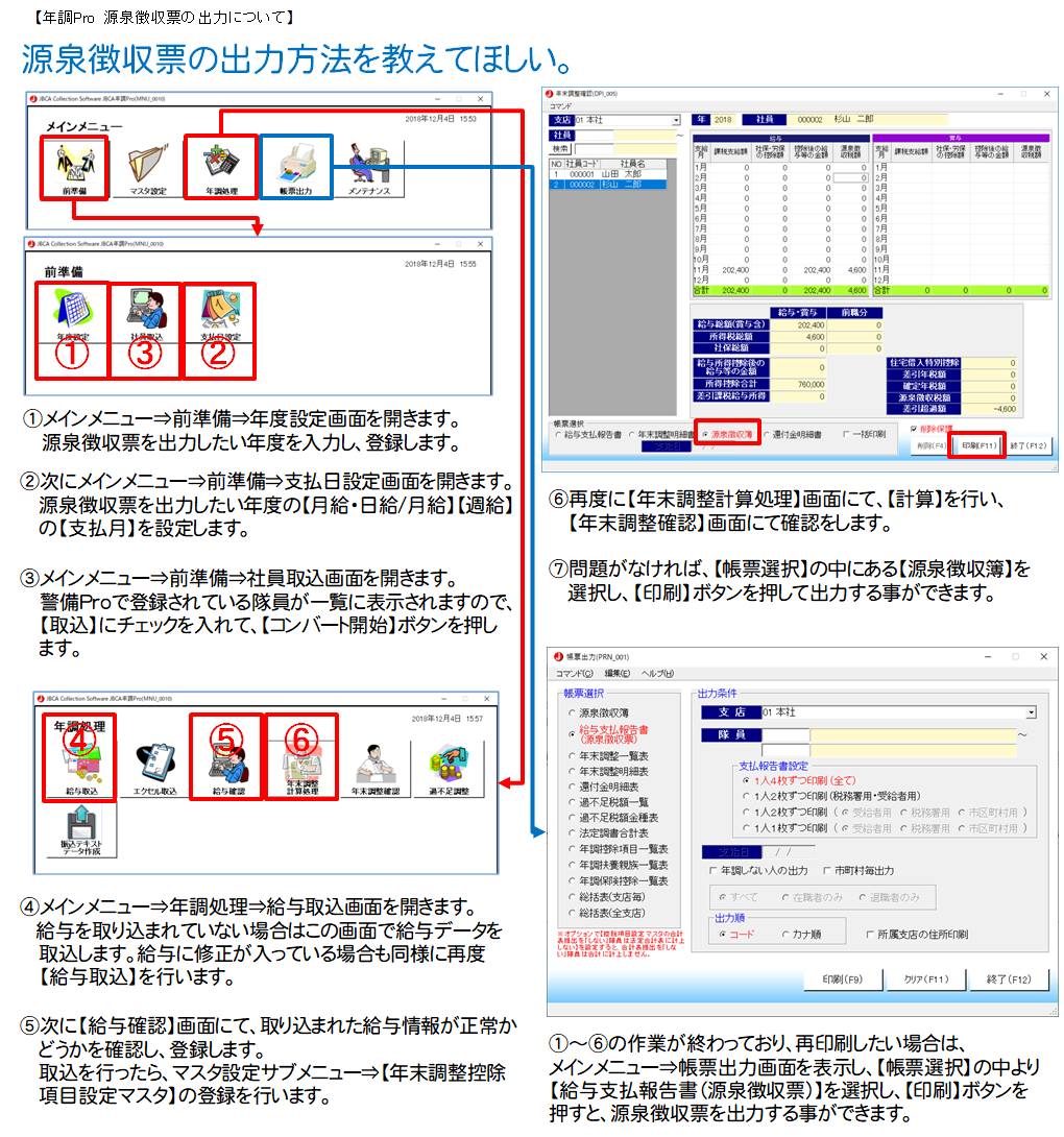 上記の①~⑦は行っている場合は、メインメニュー⇒帳票出力画面より源泉徴収票を出力する事ができます。