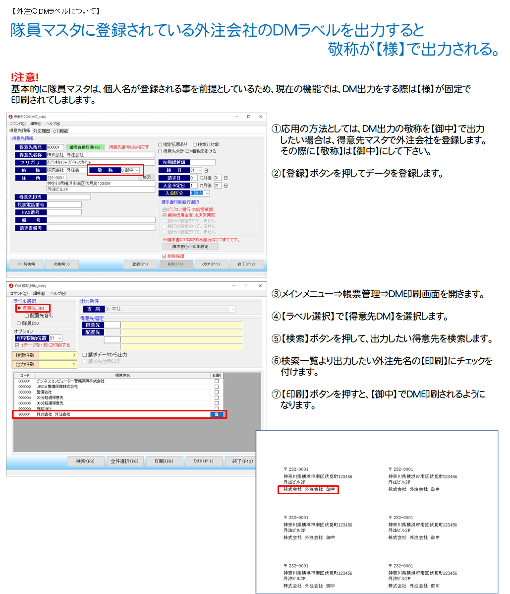 隊員マスタに登録されている外注会社のDMラベルを出力すると敬称が【様】で出力される。
