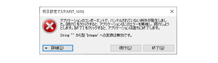 - アプリケーションのコンポーネントで、ハンドルされていない例外が発生しました。[続行]をクリックすると、