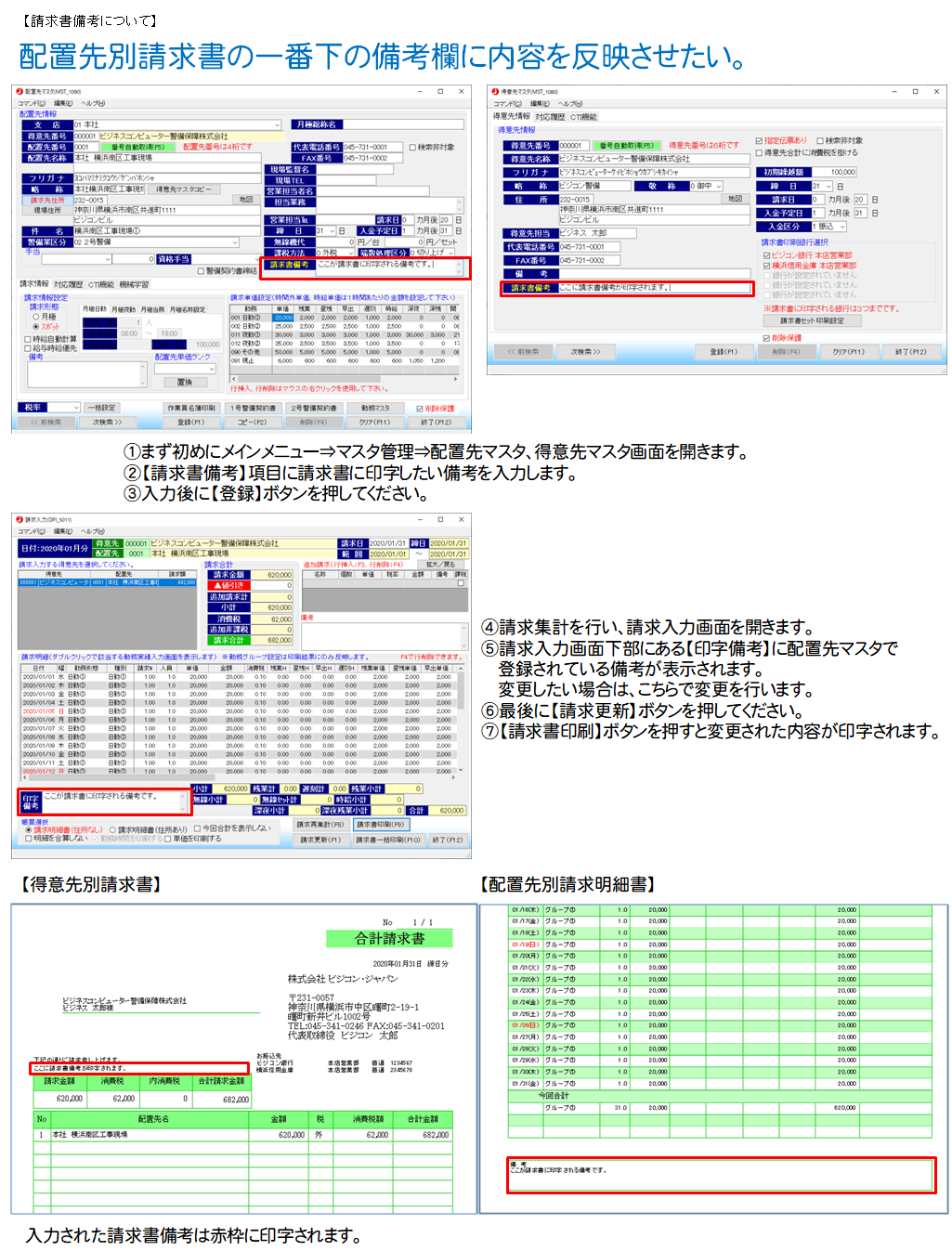 - 配置先別請求書の一番下の備考欄に内容を反映させたい。