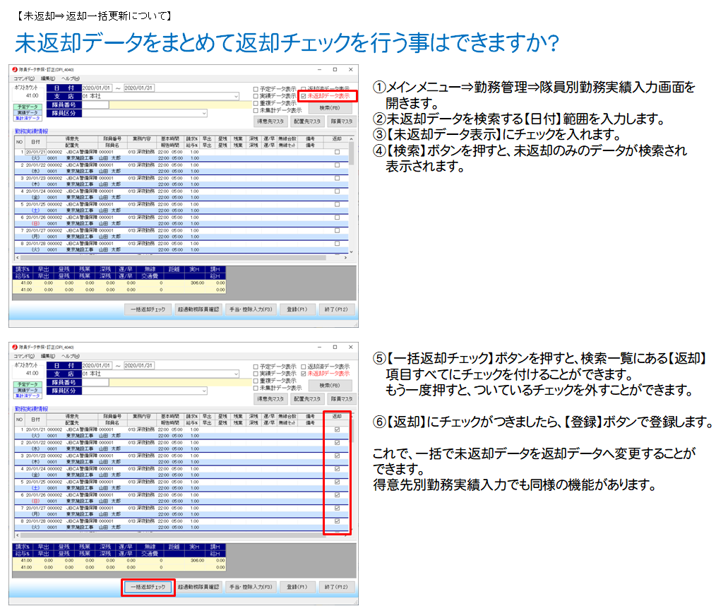 メインメニュー⇒勤務管理⇒隊員別勤務実績入力又は得意先別勤務実績入力画面より未返却データを検索後に