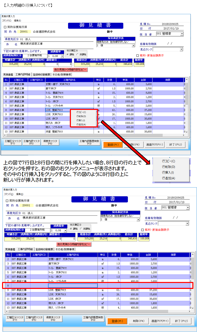明細行の上で右クリックすると、右クリックメニューが表示されますので、その中の行挿入を選択すると、選択されている行の上に新規の行が追加されます。