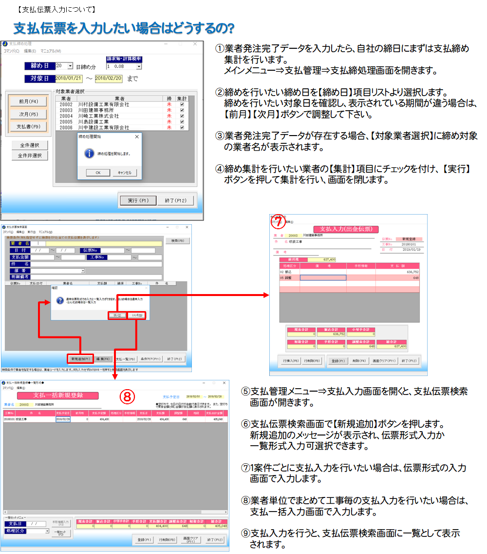 メインメニュー⇒支払管理⇒支払締処理を行った後、支払入力画面にて支払処理が行えます。